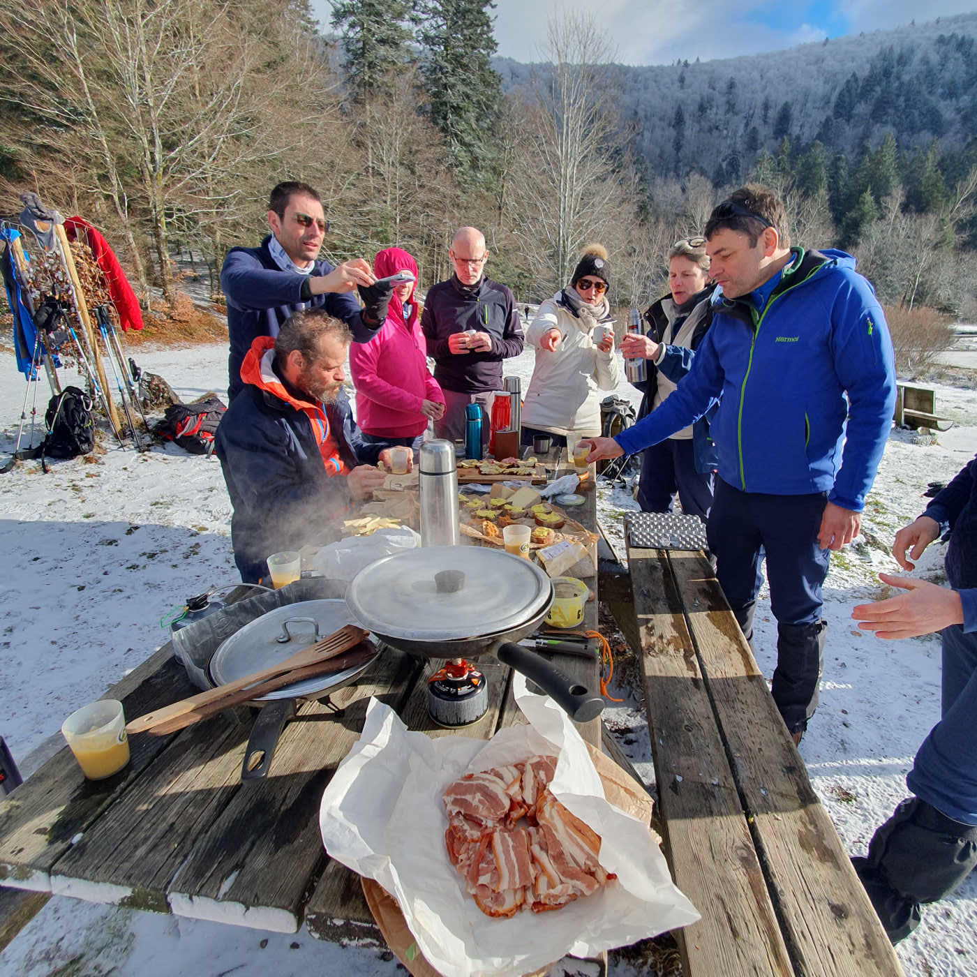 Rendez-vous à 9h30 à la gare de Colmar. Transfert en voiture d’environ 50 min en direction du point de départ de notre aventure. Nous prenons le temps de vérifier le matériel et de découvrir l'itinéraire autour d'un café d'accueil. Il est maintenant temps de chausser les raquettes et de prendre le départ de notre traversée.