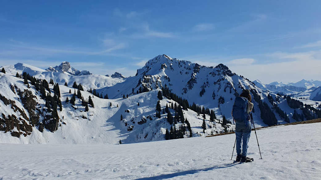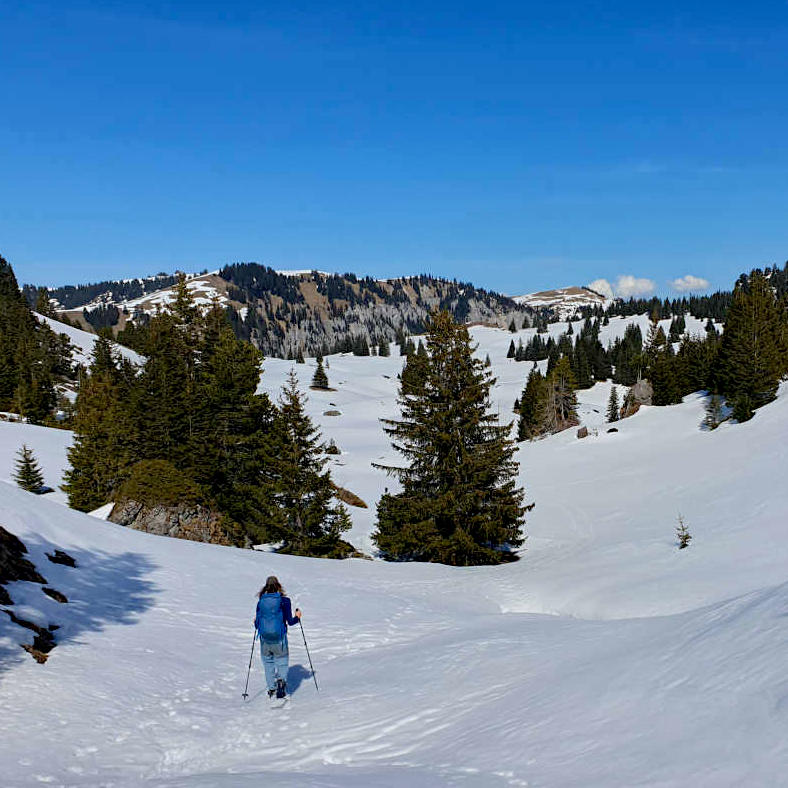 Un petit col nous permettra de rejoindre le lac Seebergsee. Nous cheminerons ensuite sur une crête qui nous offrira de magnifiques points de vue sur la vallée du Diemtigtal et la chaîne alpine. Nous verrons ainsi des sommets tels que la Blüemlisalp ou le Wildstrubel. Nous laisserons ensuite glisser nos raquettes sur de belles pentes et chemins forestiers pour atteindre, vers 15h00, le parking où nous avions laissé les véhicules.